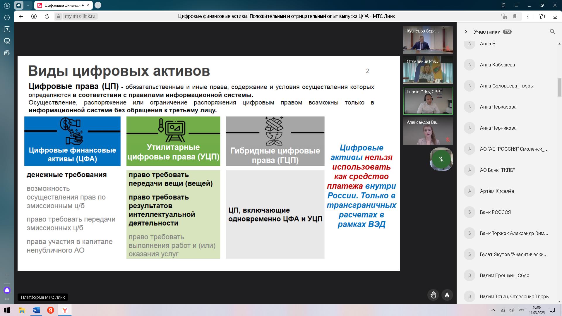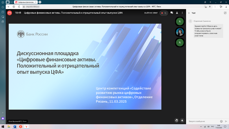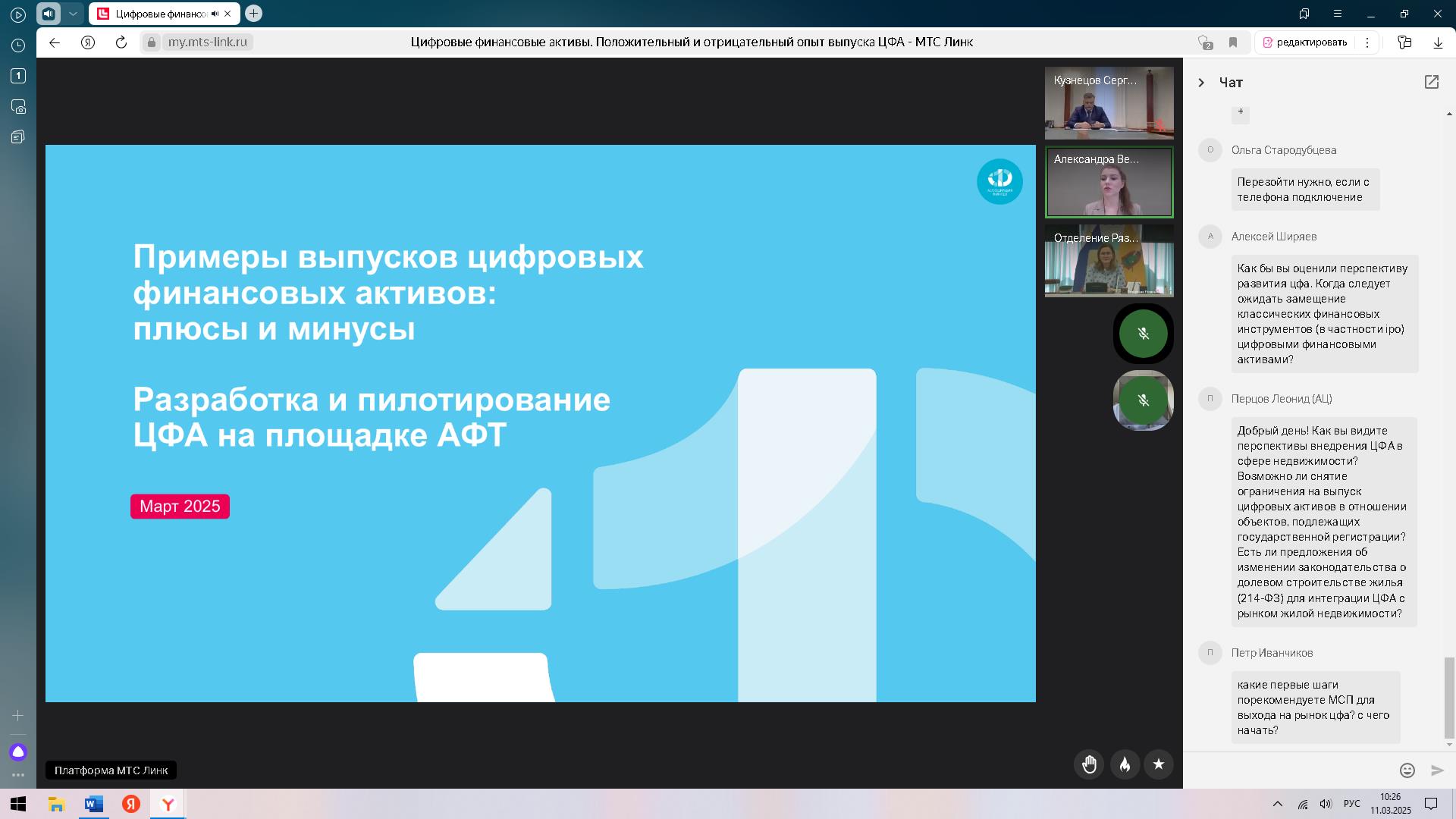 Спикерами выступили представители Банка России и Ассоциации ФинТех и бизнеса. Во время выступления были затронуты актуальные проблемы Российского рынка цифровых финансовых активов.