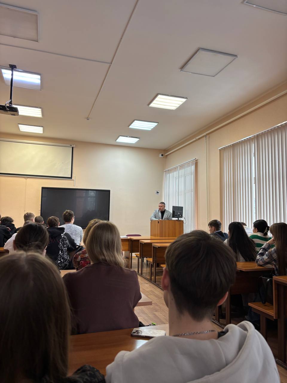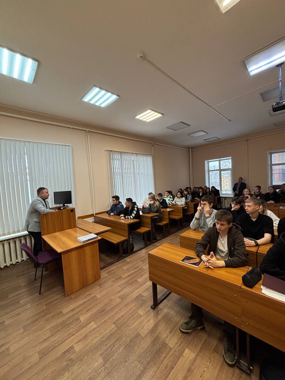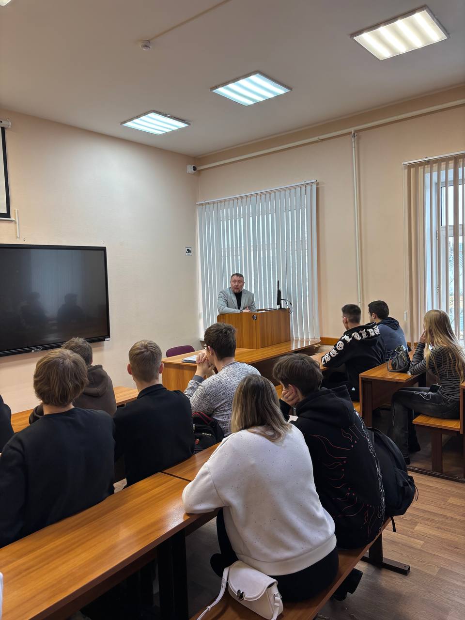 19 февраля 2026 года, в преддверии Дня Защитника Отечества, состоялся Урок мужества у студентов 1 и 3 курса направления «Экономика». Сегодняшним гостем стал Денис Викторович Дорожинский — боец штурмового отделения УФСИН. На СВО отправился добровольно рядовым. Через два месяца стал замкомандира по боевой подготовке. Участник программы «Гордость липецкой земли». Он рассказал о своем боевом пути и ответил на все вопросы студентов.