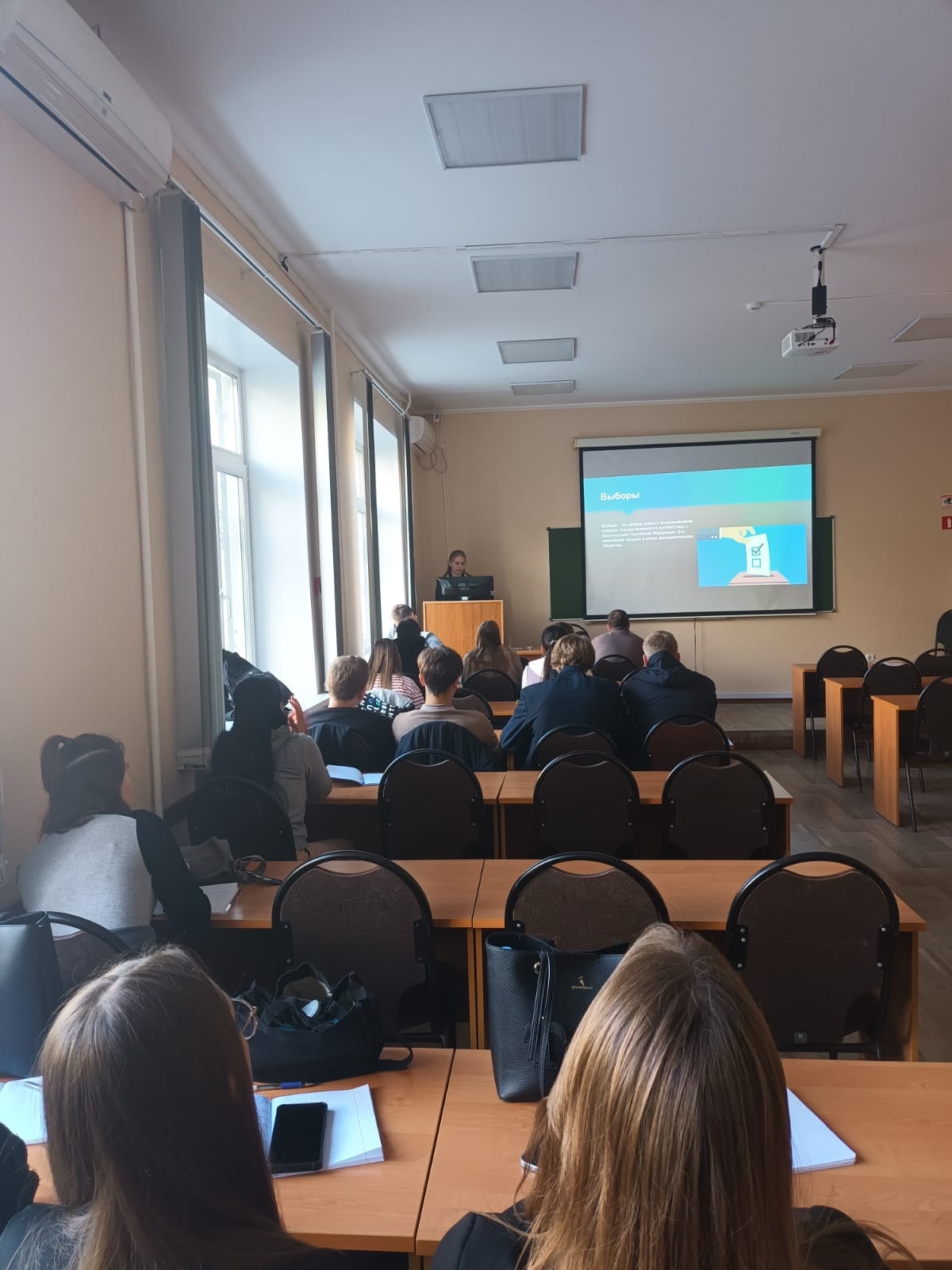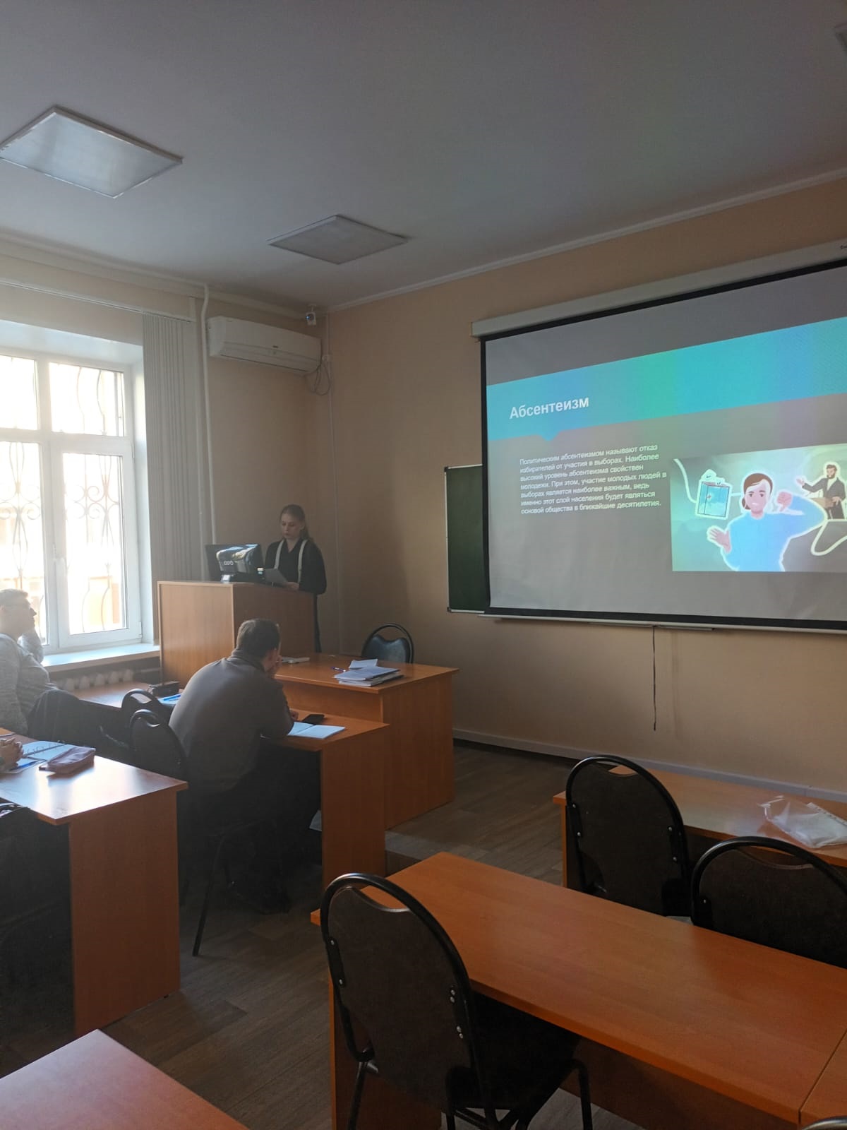 В рамках участия во всероссийском конкурсе на лучшую работу по вопросам избирательного права и избирательного процесса, повышения правовой и политической культуры избирателей (участников референдума), организаторов выборов в органы государственной власти, органы местного самоуправления в Российской Федерации и участников избирательных кампаний студенткой 2 курса, группы ЛПЦ-24 ОЗБ ФК1 Даниловой Юлией было проведено интерактивное мероприятие для студентов 1 курса очной формы обучения «Абсентеизм в молодежной среде: сделай правильный выбор».