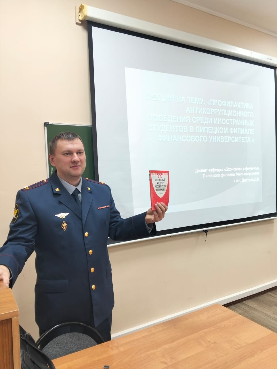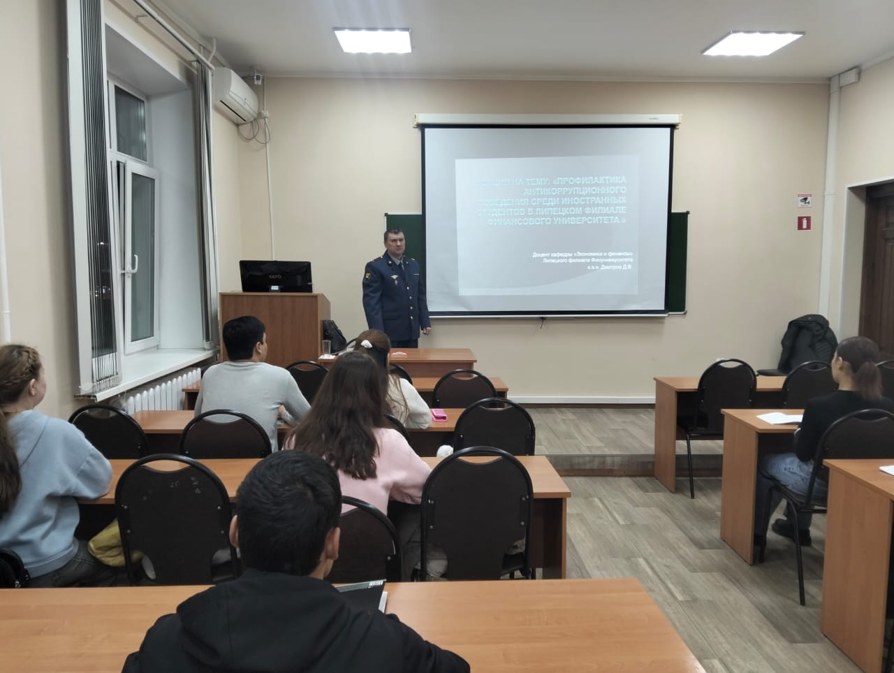 19.11.2025 в Финансовом университете (Липецкий филиал) доцентом кафедры «Экономика и финансы», подполковником внутренней службы (в отставке), Дмитровым Д.В. было проведено занятие на тему: «Профилактика антикоррупционного поведения среди иностранных студентов».