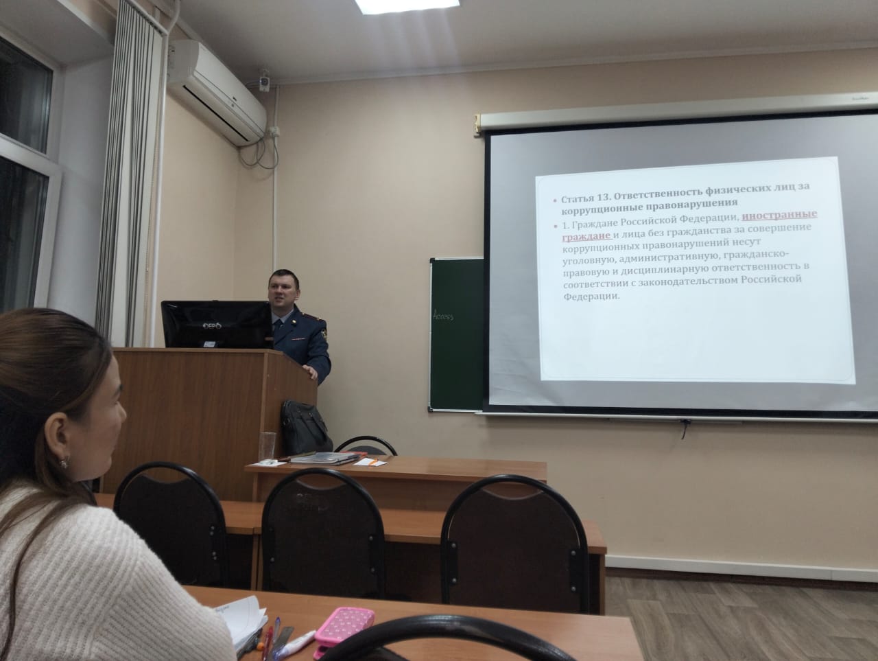 В рамках проведенного мероприятия, студентам были доведены виды ответственности за совершение коррупционных преступлений, а также основные положения Уголовного кодекса РФ и Федерального закона от 25.12.2008 № 273-ФЗ «О противодействии коррупции». Во время занятия иностранные студенты ознакомились с памяткой «Как распознать коррупционера? Признаки возможной коррумпированности работника».